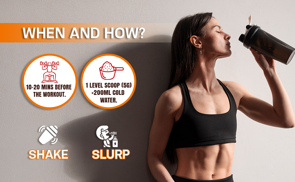 Mix one scoop of Instant Charge Pre-Workout with 200-250ml of water and drink it 20-30 minutes before your workout. This gives the ingredients enough time to kick in, so you’re ready to give your best performance! Adjust the dosage if you're a beginner or sensitive to caffeine.